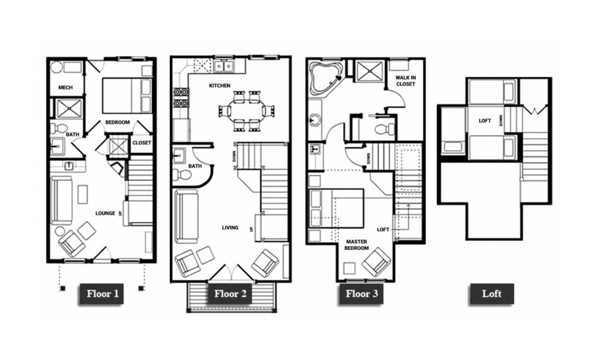 • One small loft with three twin beds (best suited for younger children-this space is not considered a 3rd bedroom)