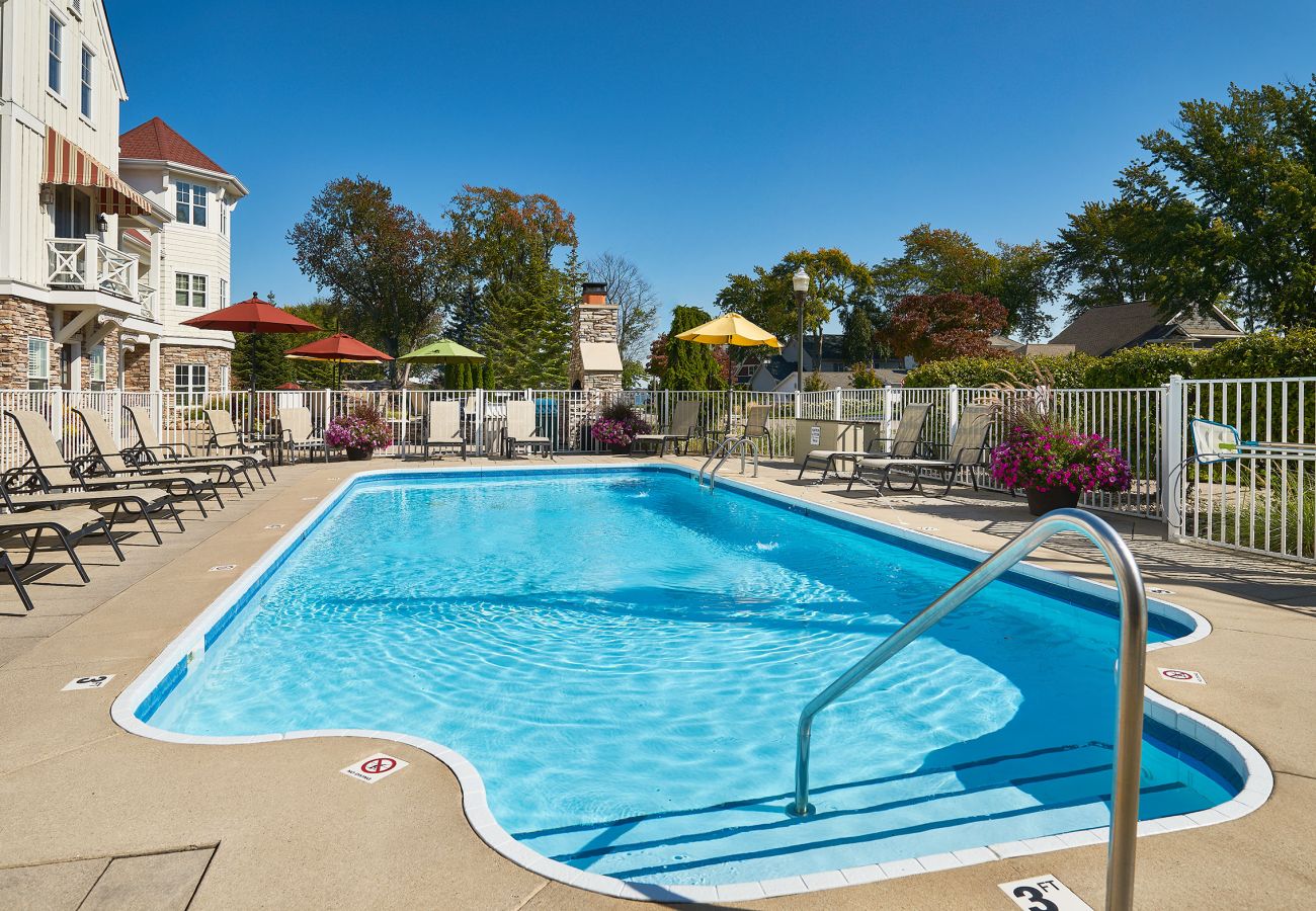 The one bedroom Nantucket configuration is considered by many to be the hidden jewel of the eight-unit property. The fully appointed chefs kitchen includes everything you need to whip up your favorite meal. The lovely living room includes a queen sleeper sofa that converts into a comfortable sleeper sofa (air coil mattress). This unit includes two tv’s, Wifi, a private bedroom, washer/dryer and a bathroom with shower, private grill and patio space. It also features a balcony with a view of the pool as well as a scenic view of Lake Macatawa. This unit configuration is NOT offered during the Summer season (see below).