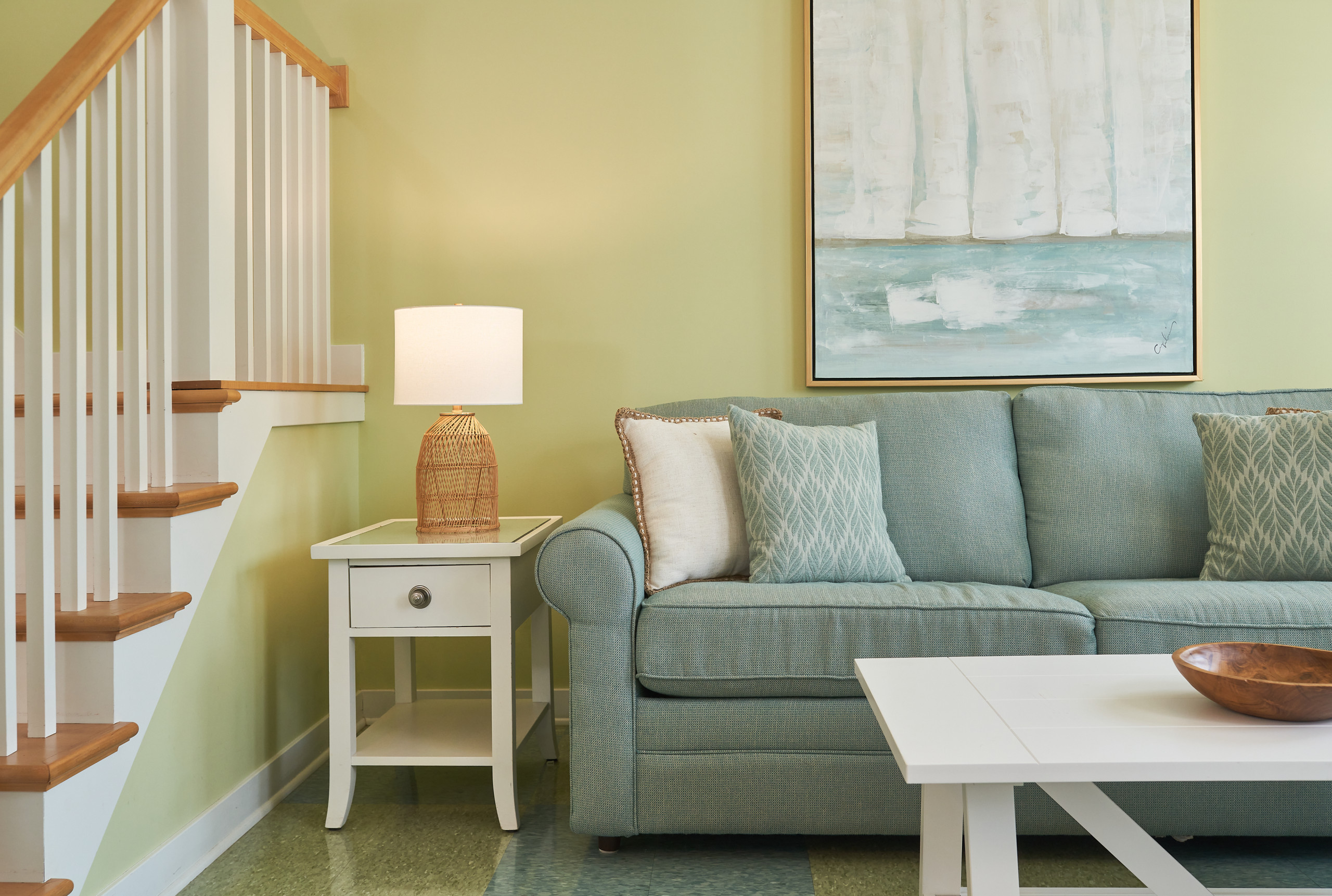 The first floor includes two bedrooms, a living area, bathroom and mini bar. This is the perfect area for guests who would rather not use the stairs. Additionally, the first floor offers the added benefit of total privacy with the ability to lock off from the rest of the unit creating a private studio space including a bunk room (sleeping up to three in twin beds), a sectional sofa with sleeper sofa (air coil mattresses for added comfort) and a private bedroom with queen size bed .
